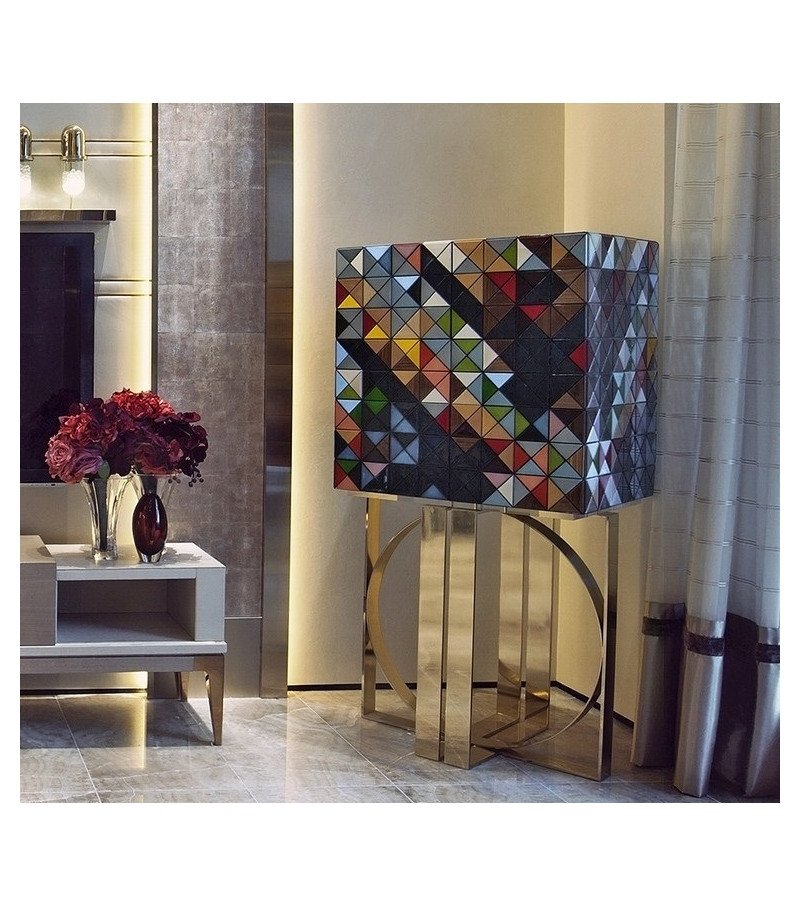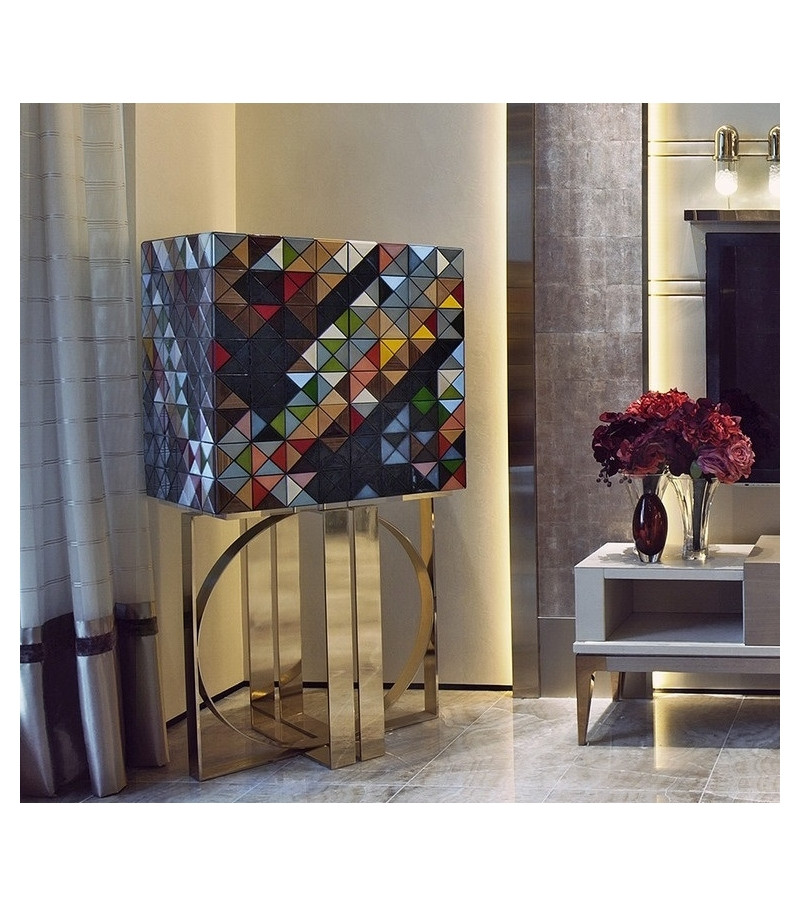 Pixel designed by Boca Do Lobo is a beautiful cabinet composed by 1088 wooden triangles in a diversity of woods and finishes: silver leaf, gold leaf, colored lacquers, and ten different types of wood leaf (ebony veneer, African walnut veneer, zebrano veneer, poplar veneer, palisander. Interior: two doors finished on the inside in a diamond quilted blue silk fabric open to nine drawers with gold knobs and a cabinet space all finished in aged mirror. Base: polished brass.
