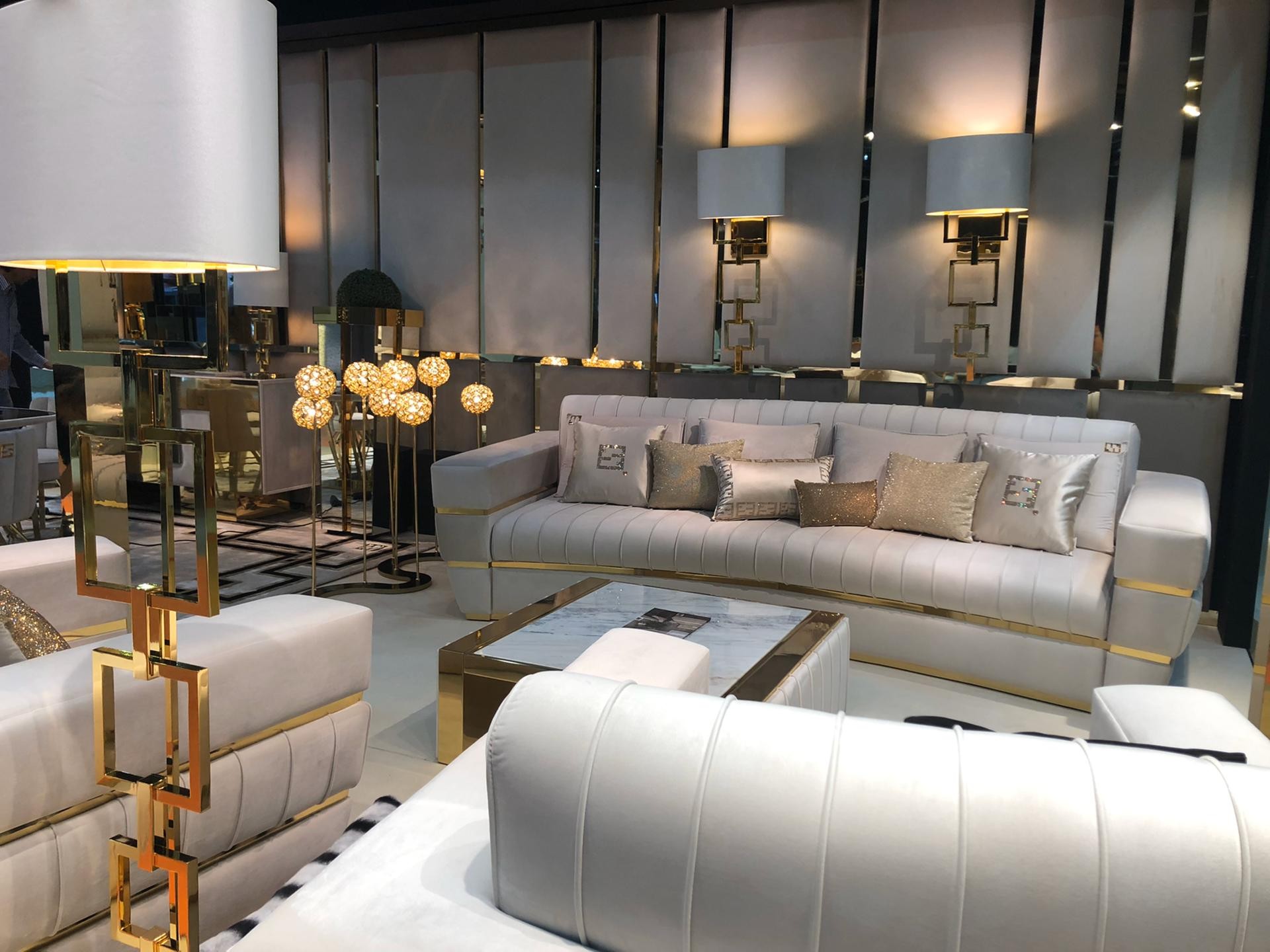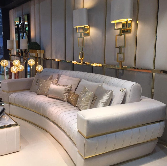 A remarkable wooden structure created by master craftsmen by hand, outstanding in its attention to detail. Sumptuously padded in various densities for the ultimate in style and comfort. Beautifully combining smooth and quilted upholstery in the finest pairing of ivory soft velvet. The sleek styling boasts a feature brass frame in a gold finish, completing this remarkable modern design. In 1 size as standard. Height 100 cm x width 300 cm x depth 160 cm, weight 300 kg. A. The 2 decorative scatter cushions also in velvet, are included. Available in an array of alternative luxury upholstery options and finishes, including traditional and faux leathers, suede and nubuck. Bespoke sizes available upon request. Prices will vary.