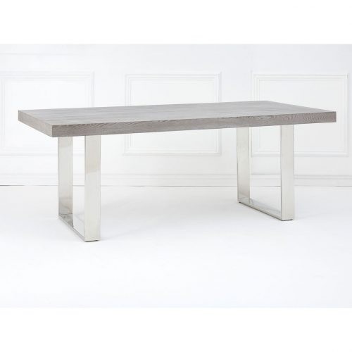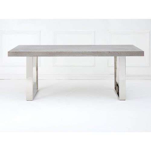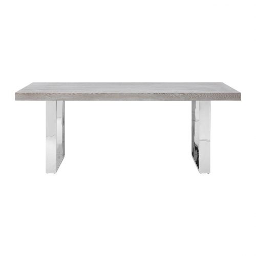 This dining table is an exquisite composite of natural elm wood and reflective steel.