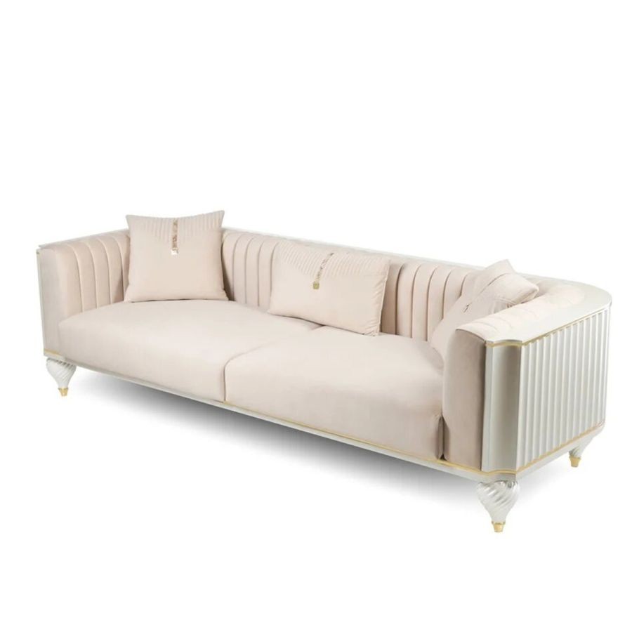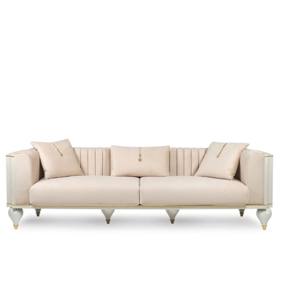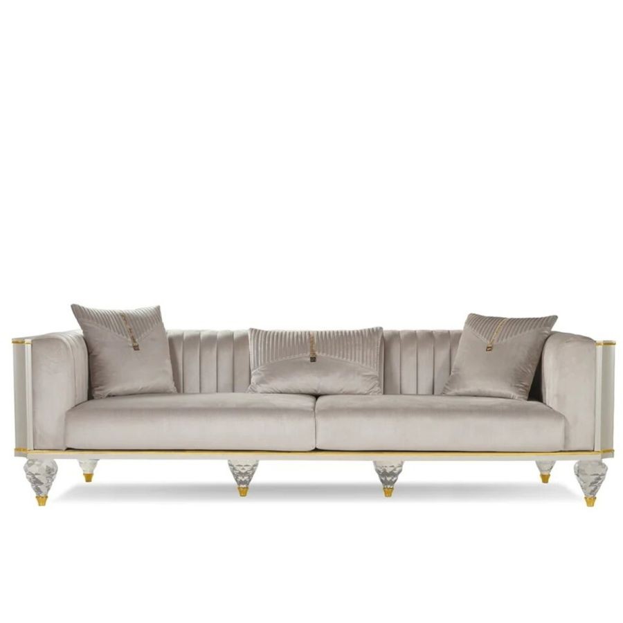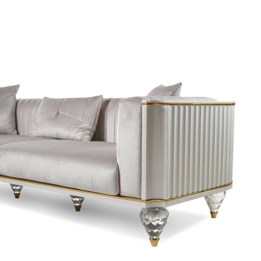 The fabulous Aella Sofa with a soft velvet upholstery and crystal legs with gold accents oozes a touch of decadence.