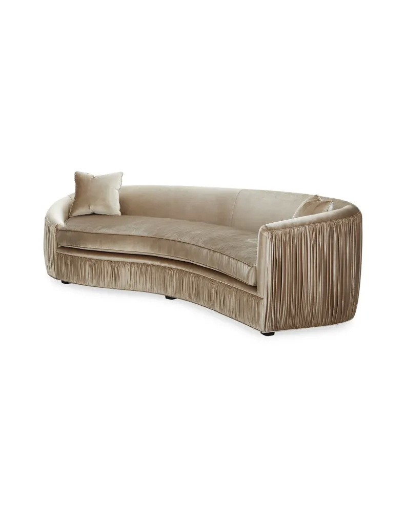 Handcrafted sofa features ruched outside back and asymmetrical silhouette