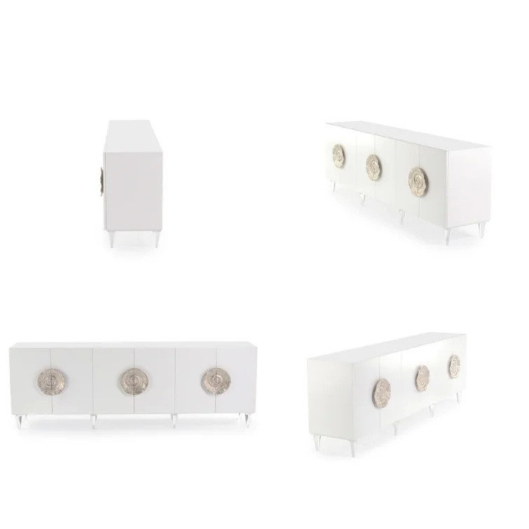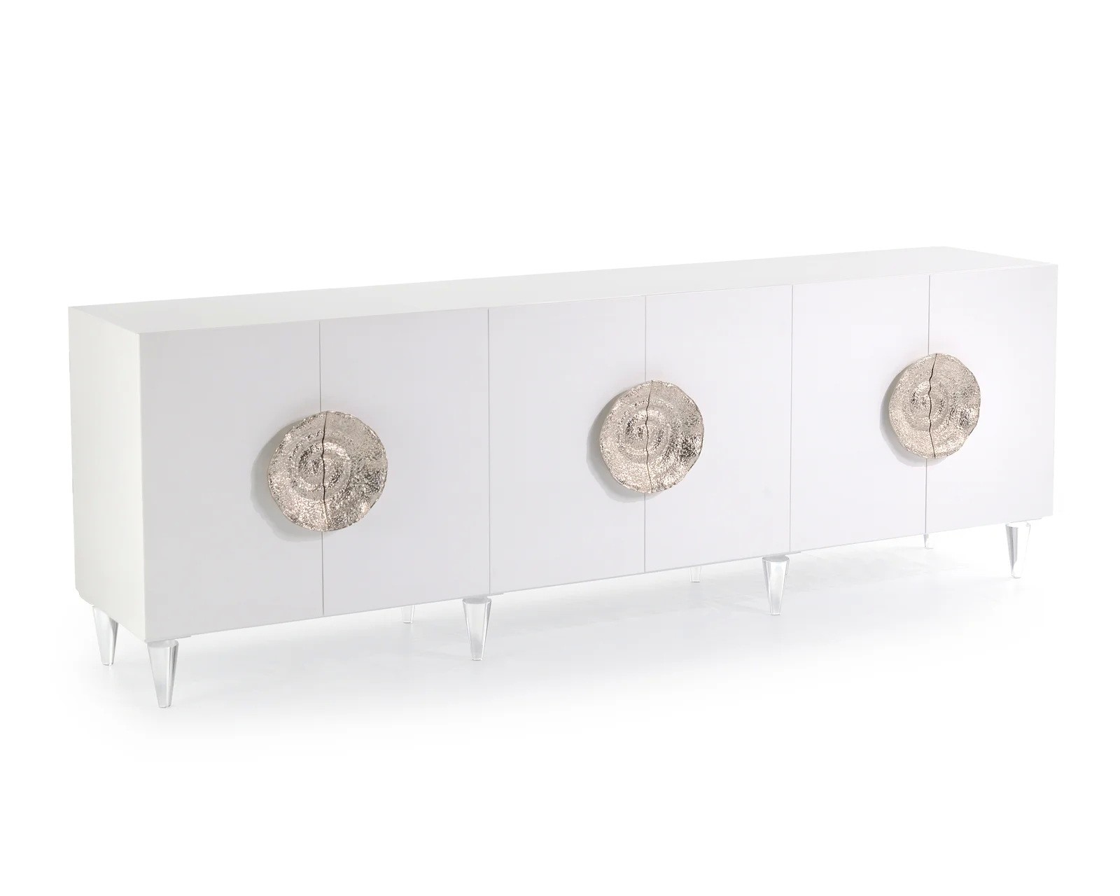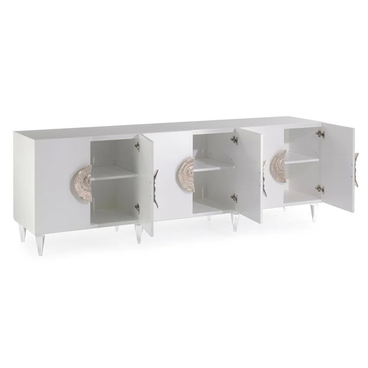 Standing on turned acrylic legs and finished in ice white, this six-door credenza has bold, silvered escargot handles on each pair of doors. Soft-closing hinges are fitted, and adjustable shelves finish out the interior.